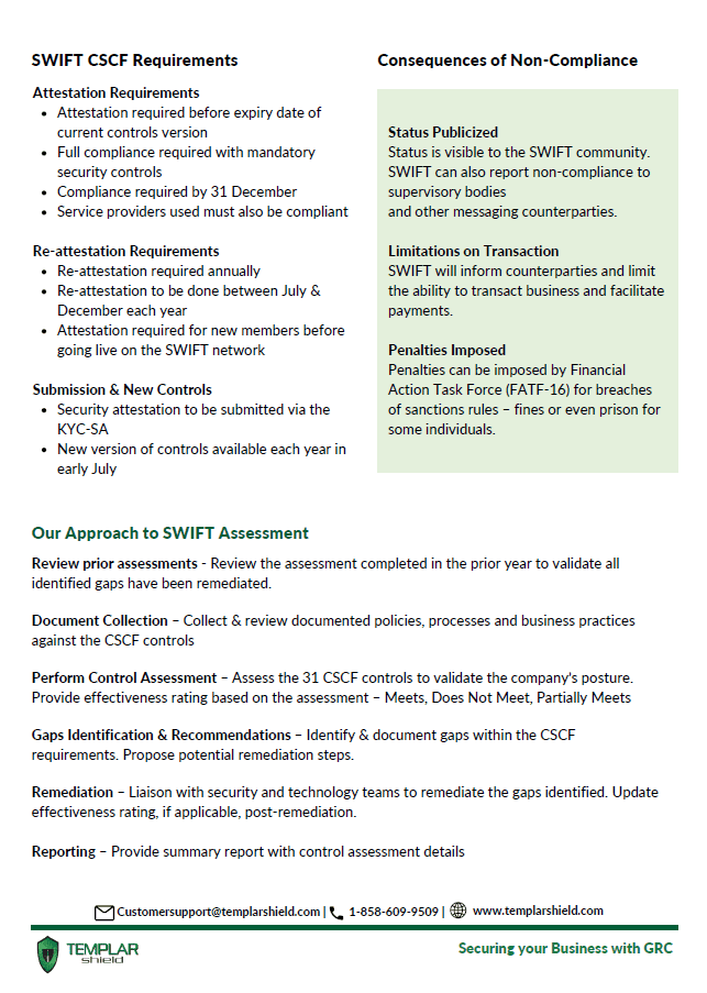 As of 2020, SWIFT mandates that attestations submitted under CSCFV2020 are independently assessed through either an internal or external assessment. Self-attestation will be considered as non-compliant after 2020.